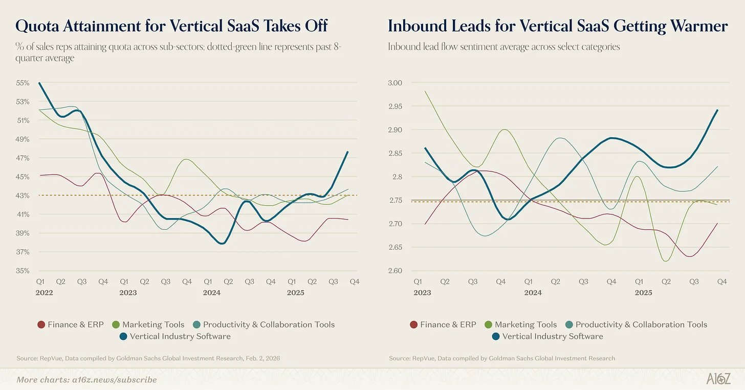 Goldman Sachs data (compiled from RepVue, Feb 2026) confirms it from the sales floor: vertical industry software quota attainment surged in Q4 2025 — above productivity tools, marketing tools, and finance & ERP, all of which stayed flat or declined. Inbound lead sentiment for vertical SaaS spiked to its highest level in three years while every other category flatlined.